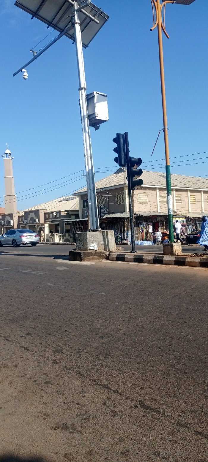 The image displays an outdoor street scene in Unknown, Unknown, under a clear, cloudless blue sky, indicating daytime. In the foreground, a dark asphalt road surface exhibits various stains and markings. A concrete median with black and white striped curbing extends from the lower right towards the center, supporting the base of a utility pole. The midground features two primary utility poles. On the left, a tall, silver metallic pole supports a large solar panel at its apex, facing upwards. Below the panel, a horizontal arm extends leftward, suspending a white dome-shaped CCTV camera pointed downwards. A white electrical enclosure box is affixed to the pole below the solar panel. To the right of this, a black traffic light signal head with three vertical lights is mounted on a separate black pole. Further right, a taller, orange-yellow metallic pole with a green-painted base and an ornate top section stands. On the left side of the road, a silver four-door sedan (possibly a Honda Accord) is partially visible, oriented away from the viewer. Its license plate is partially obscured but shows "288." The background consists of several buildings. On the far left, a light brown mosque minaret, topped with a dome and a crescent finial, is prominent. Adjacent to it, a multi-story building with a light brown facade features arched designs on its ground floor. To the right, another two-story building, also with a light brown exterior and a lighter-colored roof, presents ground-floor storefronts displaying various goods behind metal security gates or bars. Several pedestrians are visible on the sidewalk in front of these shops. One individual in a white top and dark pants walks towards the right. Another person, dressed in a light blue full-length garment, is also walking towards the right, partially obscured by the orange-yellow pole. Other indistinct figures are present near the shops. A dark vehicle and what appears to be a motorcycle or scooter are partially visible near the storefronts.