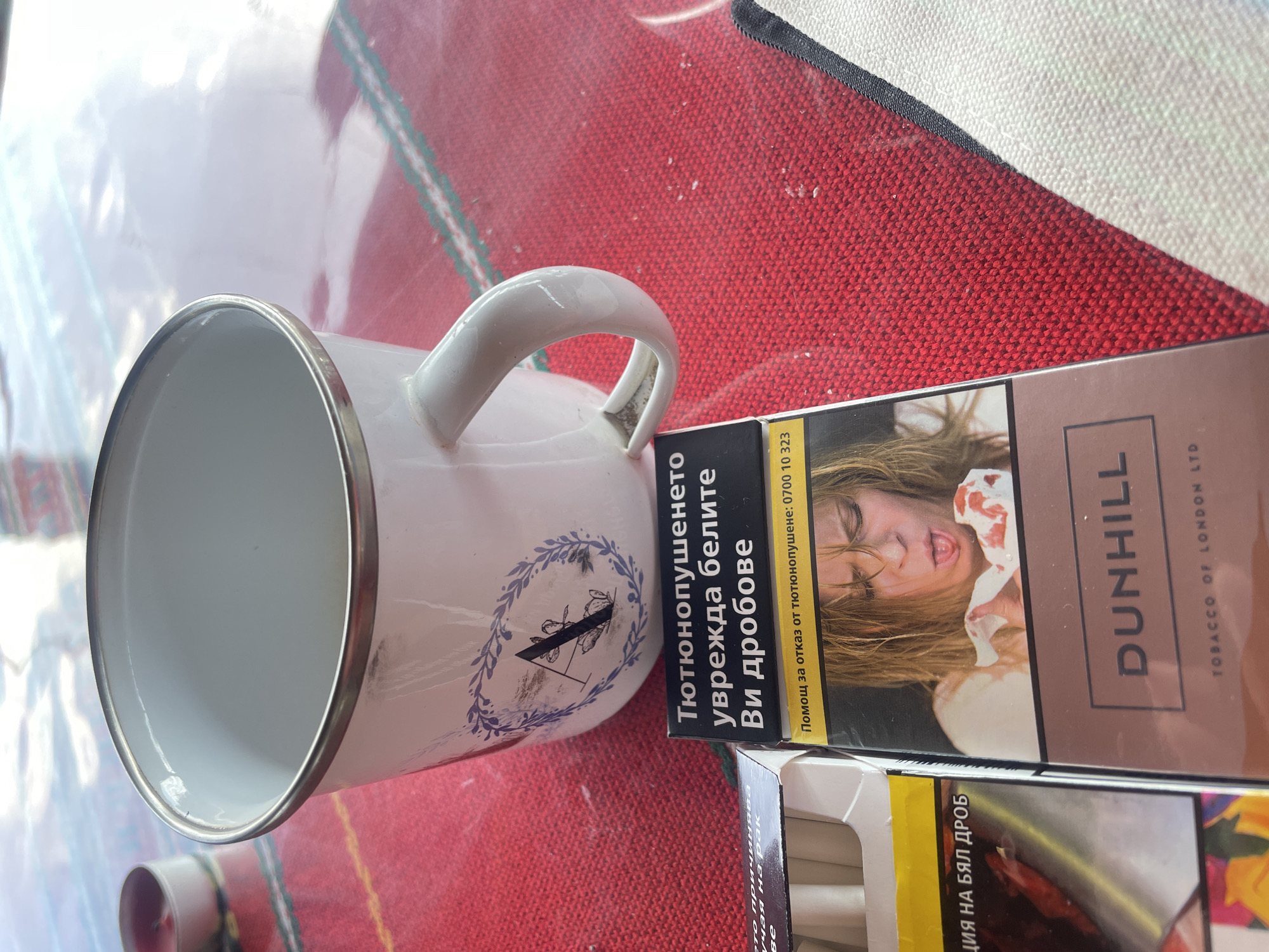 white mug with a silver rim and a design of a wreath and the letter "A" on its side, placed next to a pack of Dunhill cigarettes. The cigarette pack has a health warning label with an image of a person coughing up blood. Below the Dunhill pack, there is a partial view of another cigarette pack. The background consists of a red and white textured surface, likely a tablecloth. The language on the cigarette packs is Bulgarian, and the health warning indicates that smoking damages the lungs. While the text is Bulgarian, there are no elements in the image which would indicate that this image was taken in Dolna Mitropolia.
