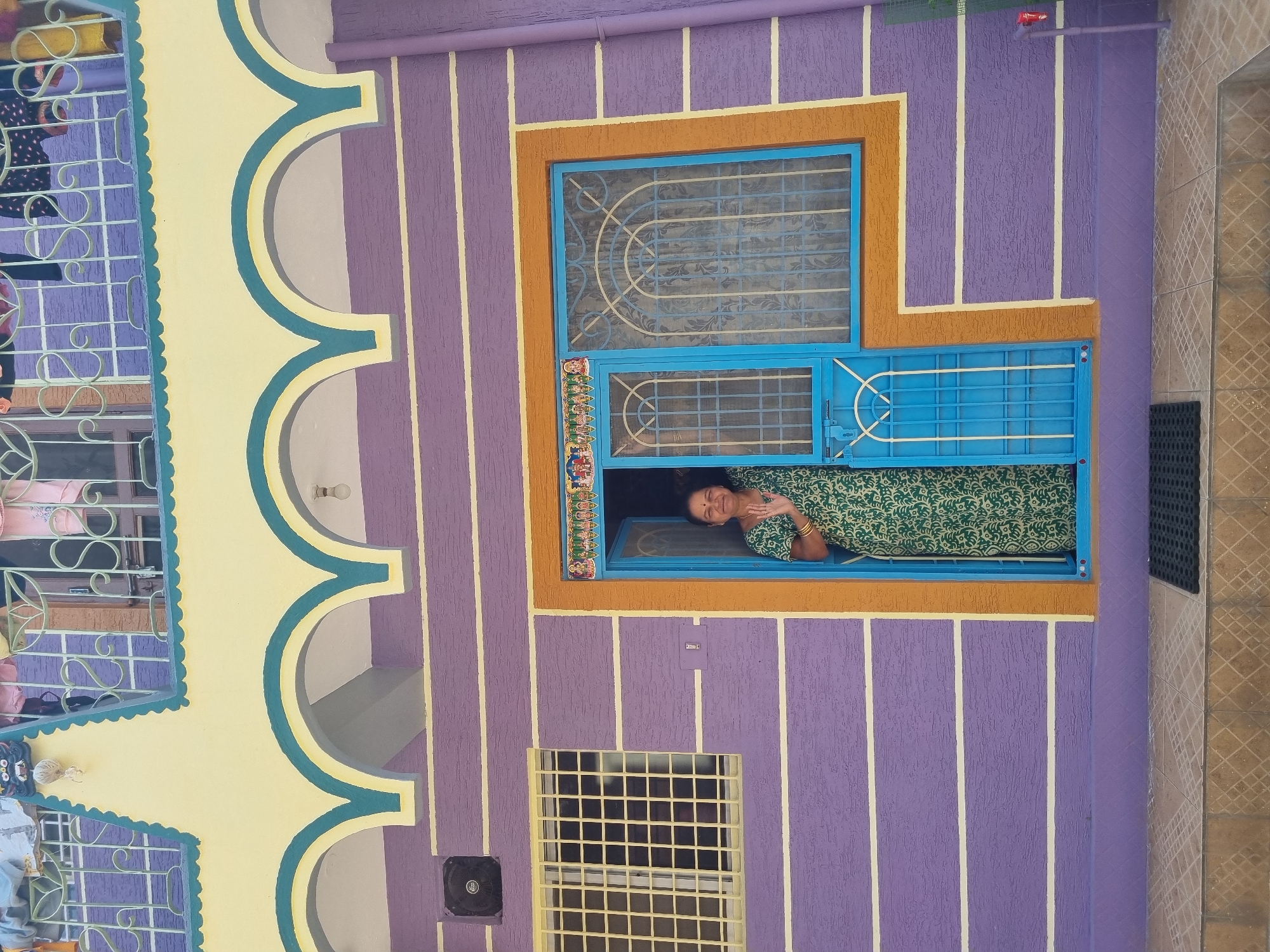 A forensic examination of the image reveals a residential building facade in Pedda Kammavaripalli, India. The structure's lower level is painted in a textured purple with four horizontal yellow stripes. The entrance, offset to the right, features a bright blue door and window frame, outlined in orange. The doorway is adorned with a decorative panel depicting multiple religious figures above the frame. A middle-aged woman, wearing a green patterned dress and gold bangles on her right wrist, stands partially visible within the open doorway, smiling and waving her right hand towards the viewer. To the left of the main entrance, a square window with a yellow grid-patterned security grate is installed. Above this window, a black rectangular exhaust fan or vent unit is mounted. To the right of the entrance, a purple utility pipe runs vertically down the wall, equipped with a red spigot near its base. The ground directly in front of the entrance consists of tan-tiled steps, leading to a black rubber doormat positioned at the threshold. A faint white design, resembling traditional rangoli, is visible on the tiles to the left of the doormat. The upper level of the building features a prominent yellow overhang with three teal-accented arches, supporting a balcony. The balcony railing is an ornate light green metalwork. Various pieces of laundry, including a pink garment, are draped over the balcony railing. An exposed incandescent light bulb is visible hanging from the underside of the yellow overhang.