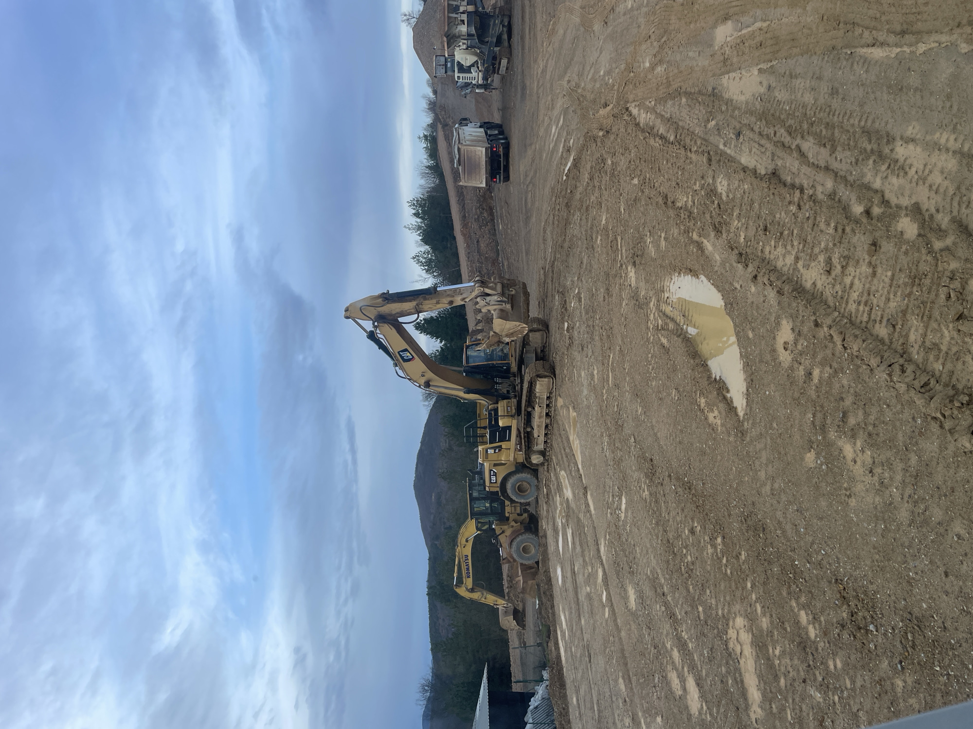 The image depicts a construction or quarry site under a cloudy sky