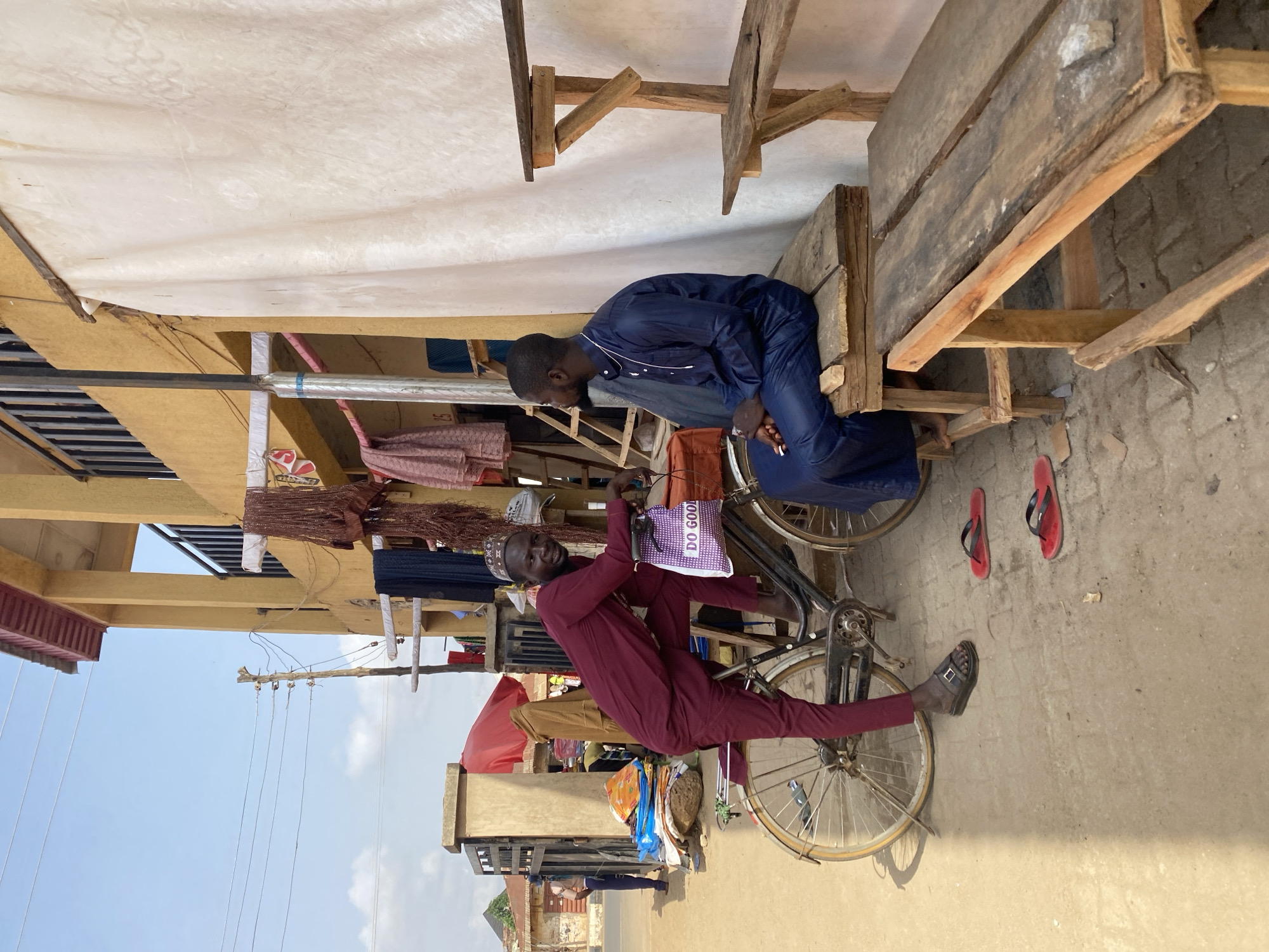 The scene is located in Kafanchan B, Nigeria, and depicts two men interacting near what appears to be a market stall. The man on the right is dressed in a dark blue robe and is leaning towards the man on the left, who is seated on a bicycle. This man is wearing a maroon robe and a white embroidered cap, and he is looking at the man in blue. The bicycle has a bag hanging on it that reads "DO GOOD". The environment includes a wooden structure overhead, presumably part of the market stall, with various items hanging from it. A wooden bench is visible near the man in blue, and red sandals lie on the ground. Power lines are visible in the background sky, and other buildings are visible.