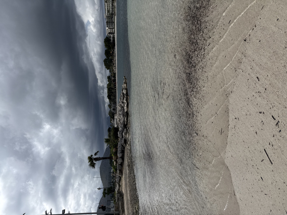 The image depicts a coastal scene in Alcúdia, Spain, under an overcast sky dominated by heavy, dark grey clouds. In the foreground, shallow, clear water with visible ripples extends over light-colored sand. Dark debris, likely seaweed or organic matter, is scattered across the wet sand and partially submerged. Midground elements include a rocky shoreline or breakwater on the left, supporting a single palm tree and various shrubs. To the left of this rocky area, a paved path or road is partially visible, with steps leading up from a gravelly section of the shore. A tall light pole and a dark-clad individual holding a mobile device, possibly a phone, are visible near these steps. In the background, a line of dark green trees borders the distant shore. Beyond these trees, multi-story buildings, likely residential or commercial structures, are visible along the coastline. Far in the distance on the left, hills or mountains are silhouetted against the sky. The overall scene suggests a coastal bay or beach area with both natural features and urban development, under conditions of impending or recent rainfall due to the heavy cloud cover.