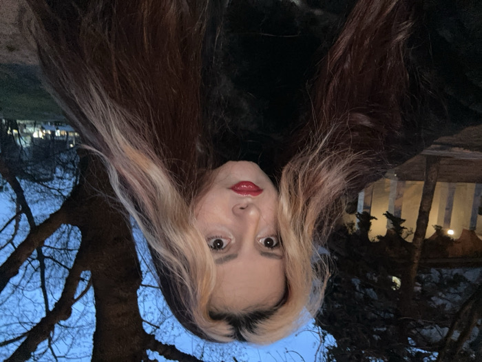 A bust-level, front-facing portrait of a female individual is captured outdoors under deep blue twilight conditions. The individual has long, wavy, multi-toned hair, featuring dark brown, reddish-brown, and prominent blonde streaks, particularly on the left side of her head. She wears red lipstick and dark eye makeup, maintaining a direct gaze towards the viewer. Her attire consists of a black or dark-colored, high-collared, textured garment. The background on the left reveals a section of a building with an illuminated arched colonnade or portico, featuring light-colored pillars. Several dark coniferous trees partially obscure the building. On the right, a large deciduous tree with visible skeletal branches stands against the sky. Beyond the trees, a park-like area with grass and distant artificial lights is discernible. The scene is located in Sofia, Bulgaria, specifically in the vicinity of the National Art Gallery (former Royal Palace) and the surrounding City Garden.