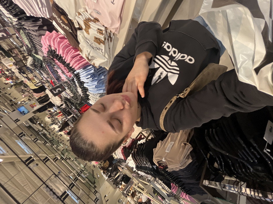 A woman with closed eyes stands in a clothing store. She wears a dark Adidas hoodie and has a patterned bag slung over her shoulder. Clothing racks filled with various garments surround her, showing a variety of colors and styles. The store setting includes a bright, overhead lighting system and glimpses of other shoppers in the background.