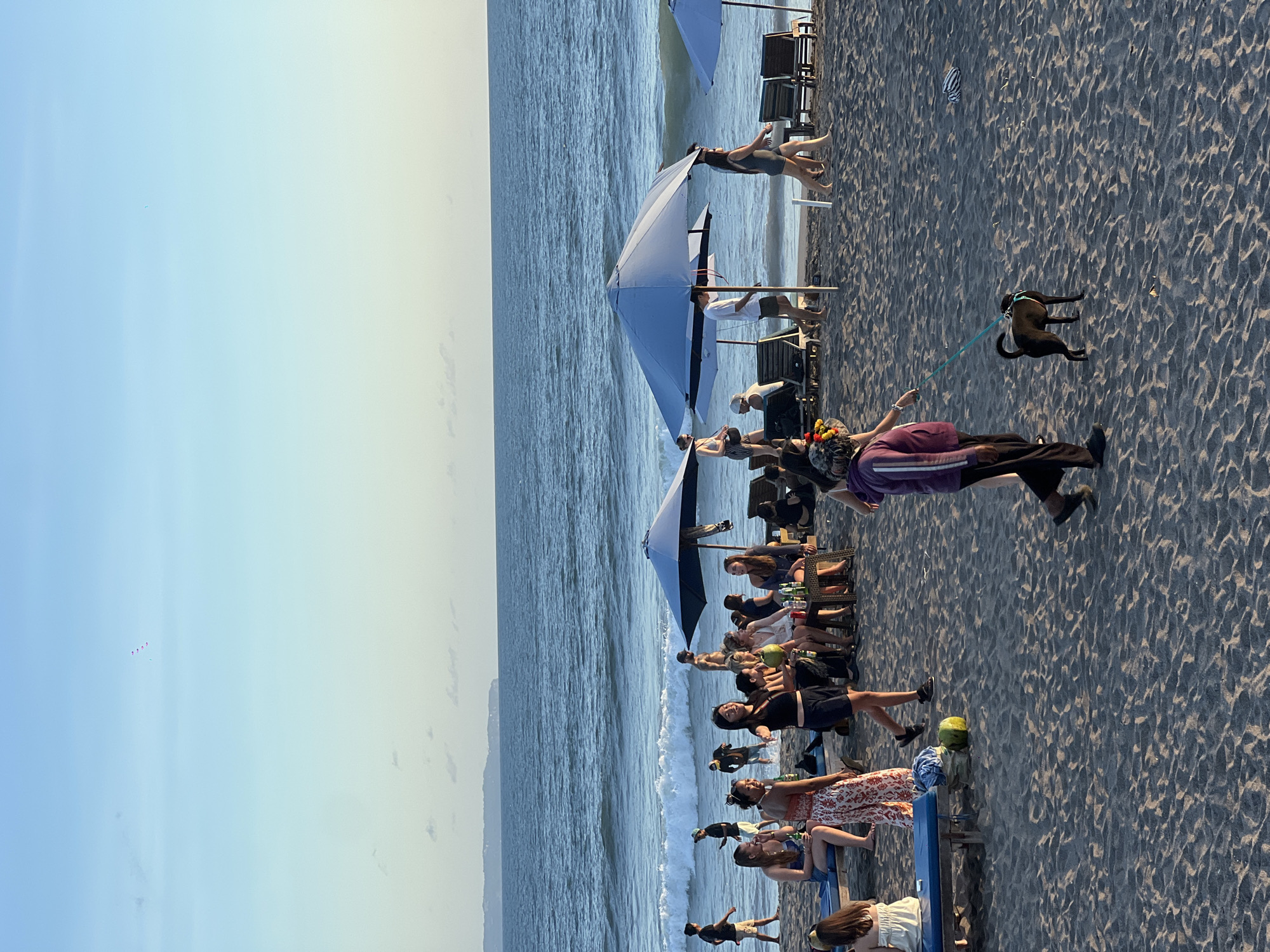 The image depicts a beach scene in Canggu, Indonesia. A group of people is sitting on benches and chairs near the water's edge, with umbrellas providing shade. One person is walking a dog on a leash. The beach has dark sand. Waves are breaking on the shore. In the distance, there is a view of the ocean and coastline. The sky is clear with a few small shapes, possibly kites, in the upper left.