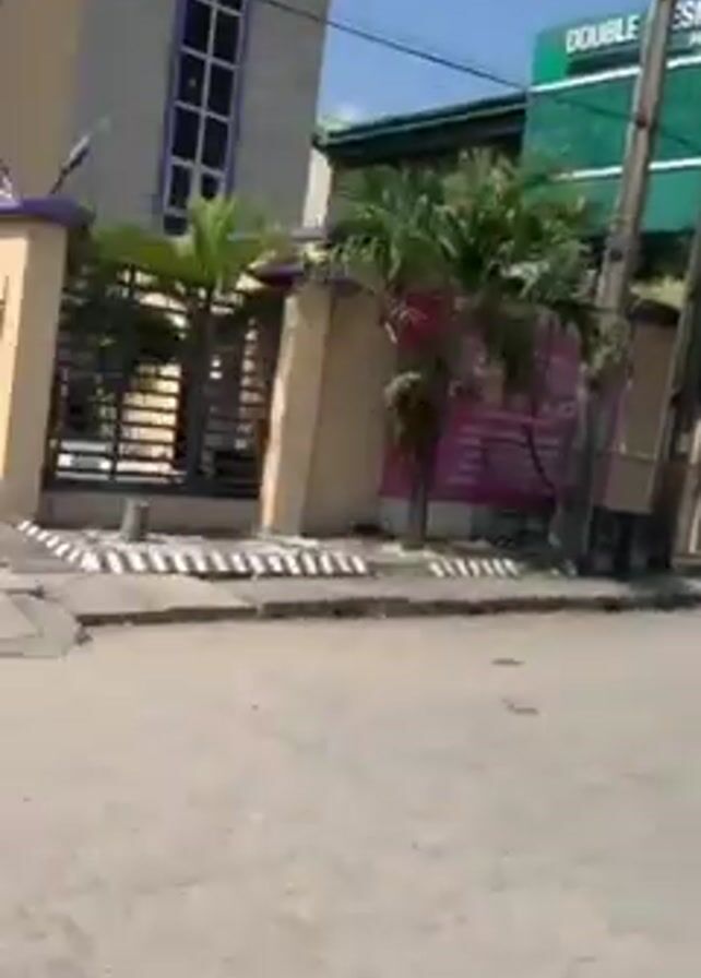 The video begins with a view down a street with buildings on either side, power lines overhead, and a few vehicles visible in the distance