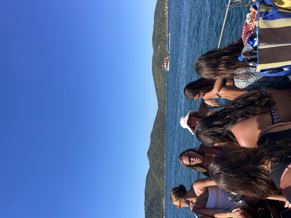 Several young women sit along the side of a boat on a bright, sunny day. They are turned towards the water, some looking out over the blue sea. Behind them, a green, hilly coastline runs along the horizon. In the distance, another boat is visible on the water. A clear blue sky covers the top left portion of the image.