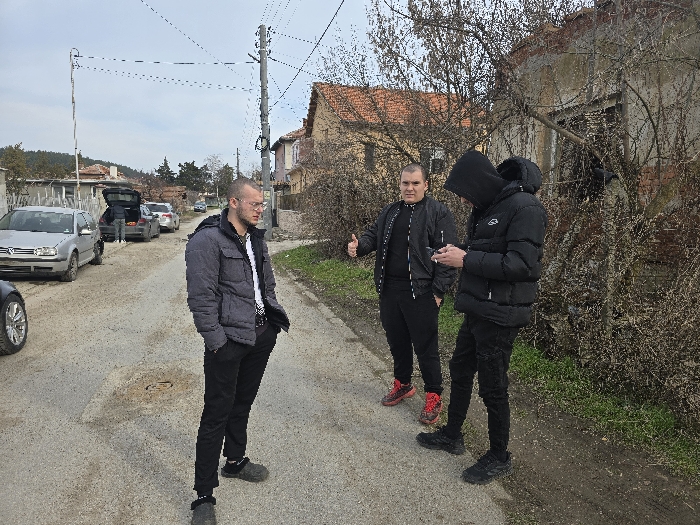 This image depicts an outdoor scene on an unpaved residential street in Cherven Bryag, Bulgaria