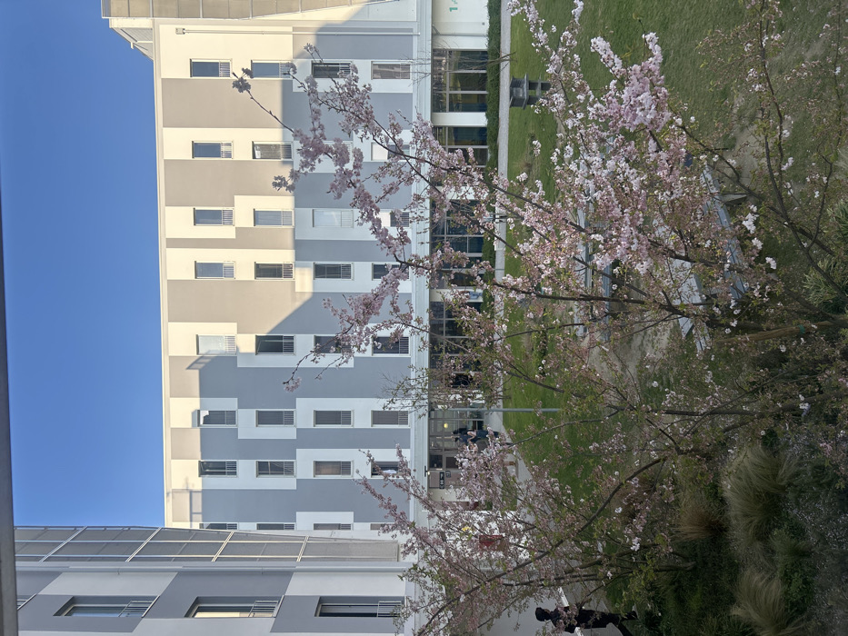 An outdoor scene in Novate Milanese, Italy, is observed from an elevated viewpoint, likely a window or balcony, under a clear blue sky. The image captures a modern courtyard surrounded by multi-story buildings with light gray and white facades arranged in vertical striped patterns. Numerous rectangular windows are visible across the building exteriors, some featuring small balconies or railings. Shadows from adjacent structures are cast upon the building facades. In the foreground and mid-ground, multiple trees are in full bloom with pink blossoms, consistent with a springtime setting. A well-maintained green lawn occupies the central courtyard, traversed by a light-colored path. Several outdoor benches or picnic tables, possibly metal or concrete, are present on the grassy area. A dark-colored outdoor receptacle stands on the grass to the right. On the ground floor of the primary building opposite the viewer, large glass panels indicate common areas or entrances. Near one entrance, a red wall-mounted utility box is visible. Approximately six individuals are clustered near this entrance; their specific actions are indistinct due to distance, but they appear to be standing and congregating. One silhouetted figure in dark clothing walks from left to right on a path in the lower-left portion of the frame. The overall environment suggests a contemporary residential, academic, or corporate complex.