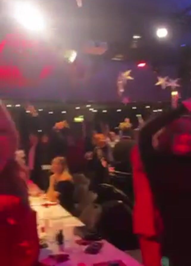 live music performance at an indoor venue. People are enjoying the music, some with their hands raised in the air. There's a band on stage with a lead singer in a black outfit. He is holding a microphone and singing. There's a keyboard player to his left, and a drum set behind him. The stage is illuminated with red and blue lighting. The venue has decorations, including star-shaped ornaments hanging from the ceiling. Tables are set up for dining, with drinks and place settings visible.