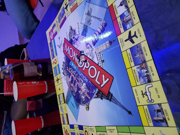 A Monopoly World Edition board game is prominently displayed, featuring global landmarks such as the Eiffel Tower and Big Ben