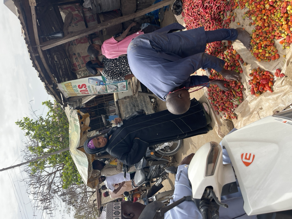 An outdoor market scene in Unguwar Gabas, Nigeria, is depicted under bright daylight