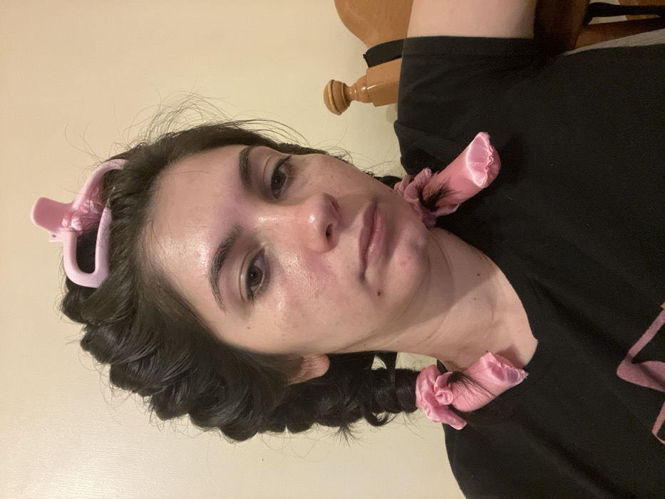 A medium-shot portrait depicts a young adult female indoors, situated in Shrewsbury, United Kingdom. The subject has dark hair, styled with multiple sections rolled or pinned on the top and sides of her head, secured by a pink plastic claw clip. Two sections of her hair are wrapped in pink satin fabric rods, resting against her shoulders. Her face, exhibiting a light complexion with some areas of redness, is directed towards the viewer with a neutral expression. She wears a dark, short-sleeved t-shirt. The background features a plain, light-colored wall. A light-brown wooden object, possibly a bed headboard with a turned finial, is partially visible on the right side of the frame.