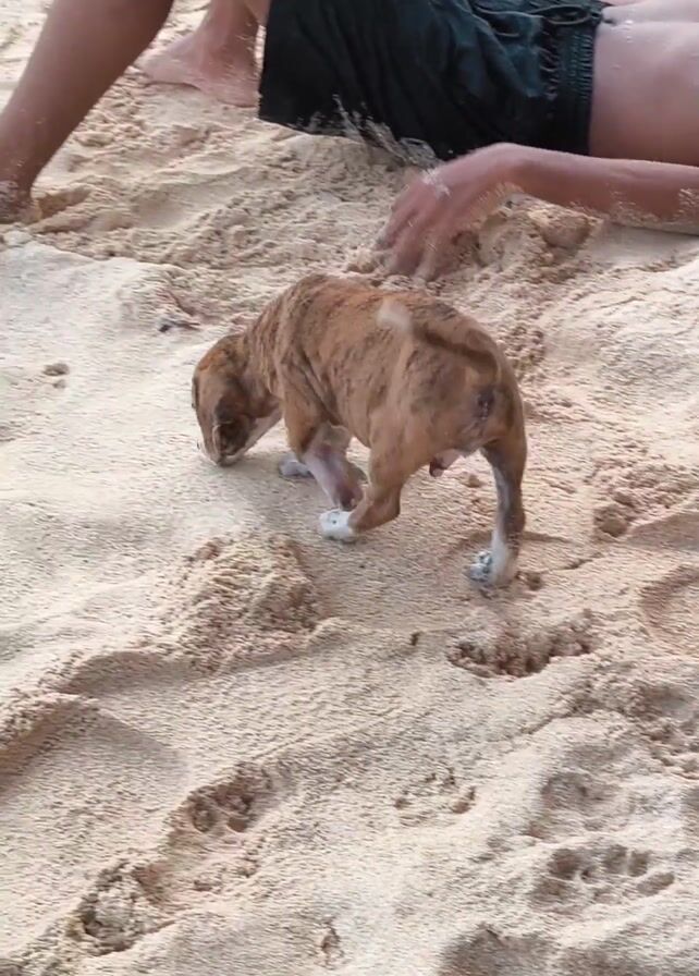 brindle-colored puppy exploring a sandy beach