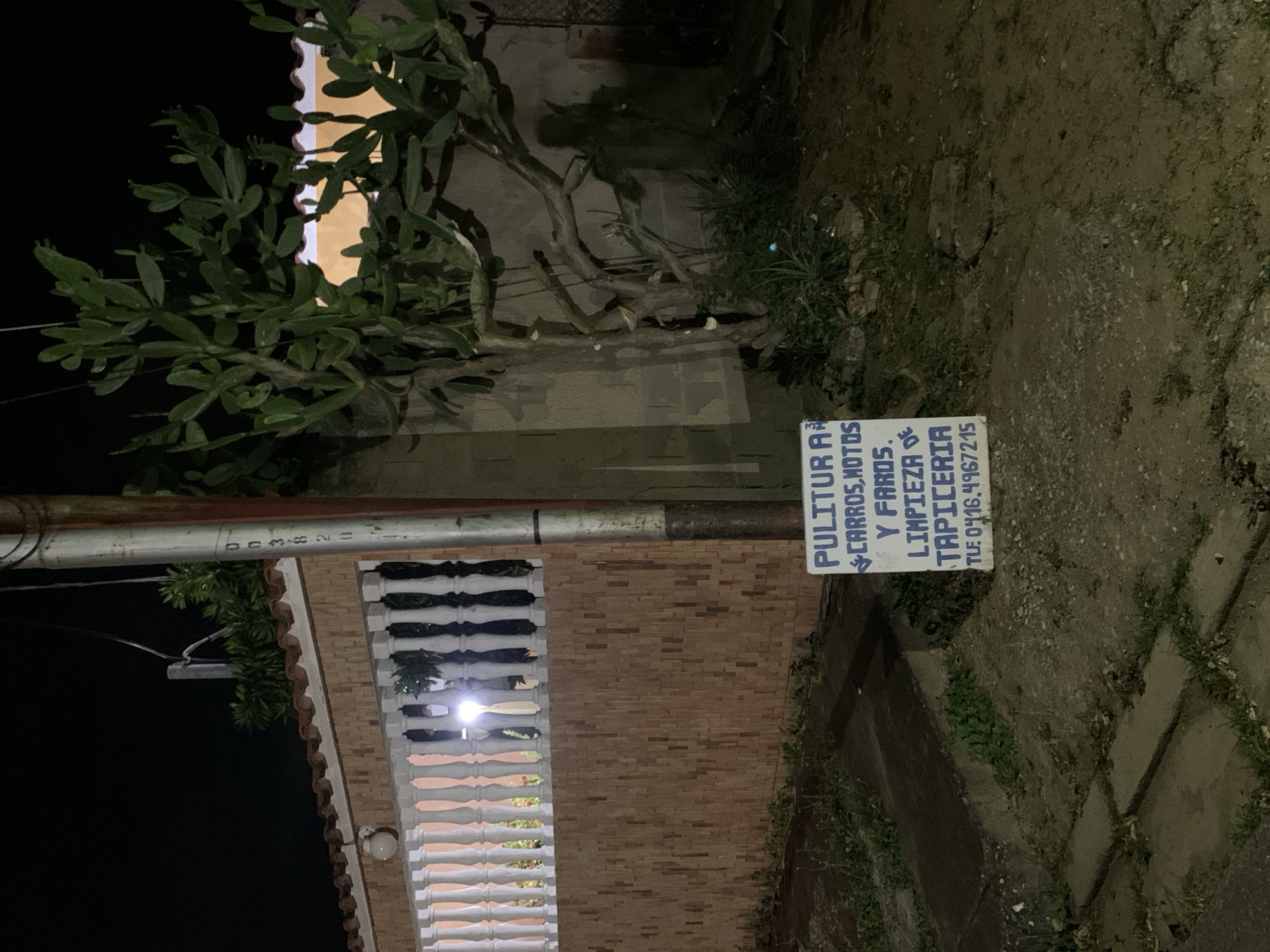 street scene at night, likely in a residential area. A white sign is prominently displayed, advertising "PULITUR A CARROS, MOTOS Y FAROS," which translates to "Polishing Cars, Motorcycles and Headlights." The sign also mentions "LIMPIEZA DE TAPICERIA," meaning "Upholstery Cleaning," and includes a phone number: TLF. 0416,4967215. The sign is situated near a concrete curb or wall, with vegetation growing around it. In the background, there's a building with a brick exterior and a white decorative railing, illuminated by a light. Overhead, a utility pole is visible. The image is taken in a slightly skewed perspective. The location is presumed to be La Tagua, Venezuela.