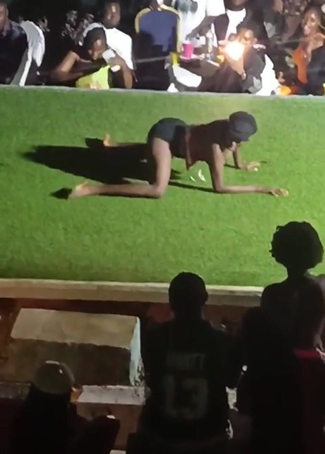 woman dancing on artificial turf at what appears to be a party or event. She is wearing a dark-colored top and shorts and is barefoot. She begins on her hands and knees and moves fluidly, eventually going prone on the turf. In the background, there are several people standing and sitting, watching her. A man in a white shirt appears to be preparing drinks. The scene is dimly lit. One man in the foreground is wearing a jersey with the number 13 on the back. The video is taken from a low angle, making the dancer the main focus.