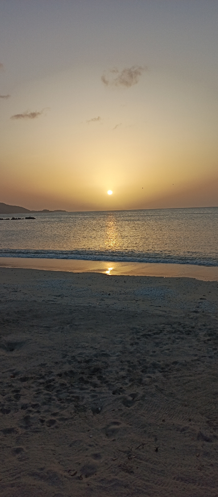 The image displays a sunset over a coastal area in Juan Griego, Venezuela, viewed from a sandy beach. The sun, a distinct bright yellow orb, is positioned centrally in the sky, slightly above the horizon, casting a direct golden reflection path across the water towards the viewer. The sky exhibits a gradient from a pale blue-grey at the top, transitioning to a warm orange-yellow closer to the horizon. Several small, dark grey clouds are scattered across the sky, with two small, dark avian silhouettes visible to the right of the sun. The body of water is dark blue-grey, showing minor ripples and gentle waves breaking into white foam along the immediate shoreline. On the left side of the mid-ground, a dark, elongated formation, appearing to be a cluster of small boats or a low-lying structure, is partially submerged or floating on the water. Beyond this formation, a dark landmass is silhouetted against the bright sky. The foreground consists of dark, damp sand, showing textural variations, including footprints and small, lighter-colored shells or pebbles near the waterline. No human figures are visible.