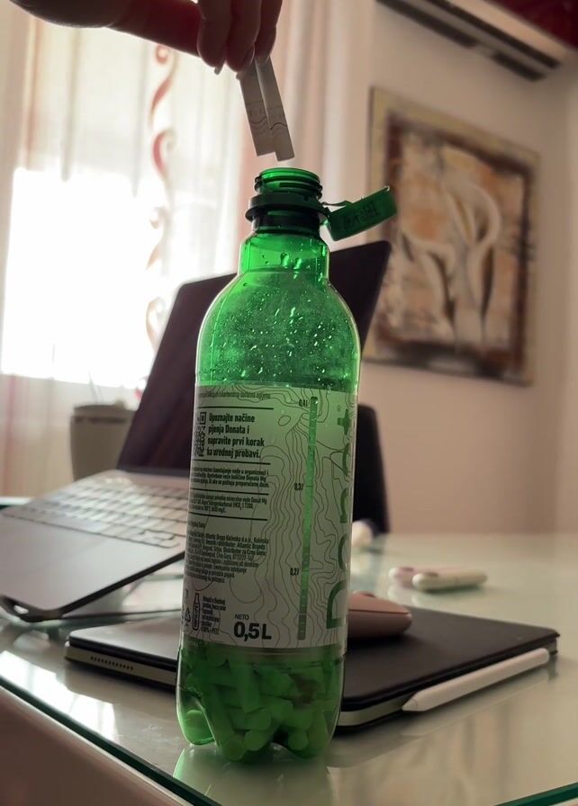 A person is shown on camera placing a white, folded paper packet into a green plastic water bottle, which is sitting on a glass table next to a closed laptop, smartphone and writing pad. The bottle is roughly half-filled with bright green rectangular capsules. The person closes the cap of the water bottle after inserting the paper. In the background is a window, and a modern painting of what appears to be an elephant. An air conditioning unit is mounted high on the wall.
