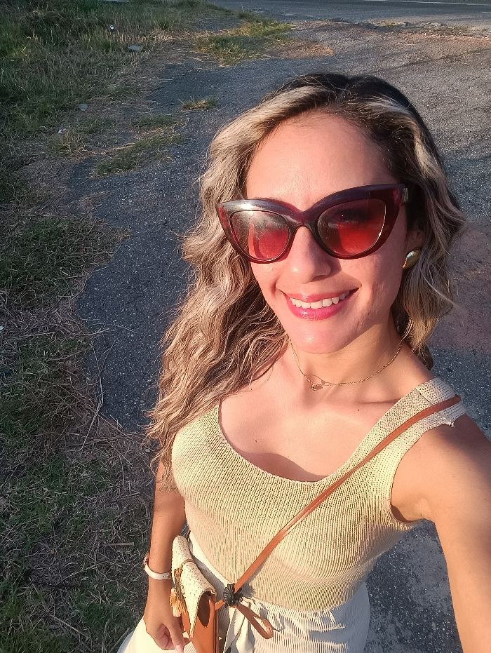 A woman with blonde wavy hair and sunglasses smiles directly at the camera. She wears a tan ribbed tank top and a small crossbody bag with a brown leather strap. A gold necklace and earrings are visible. The background features a gravel path, grass, and a road under the evening sun.