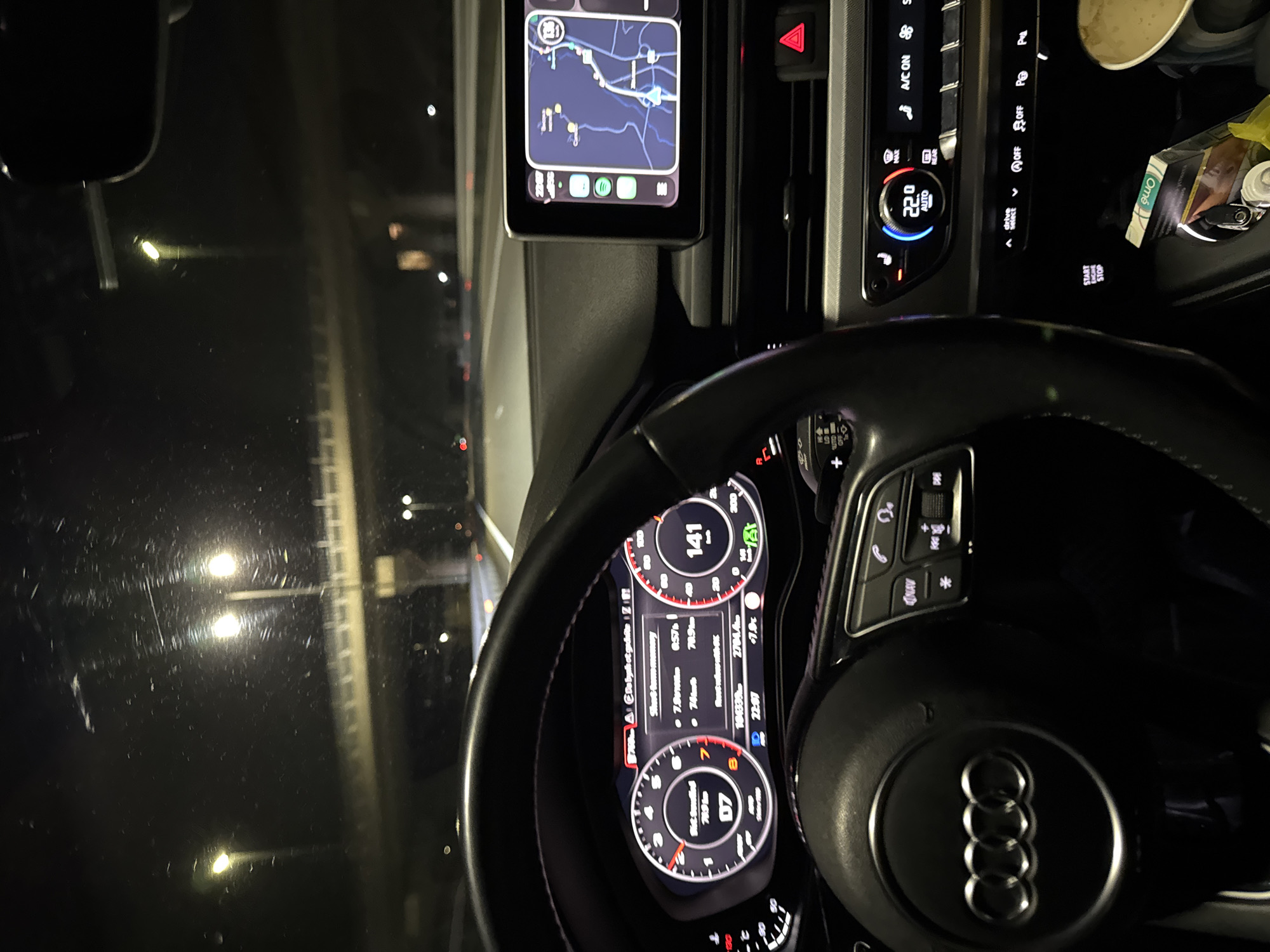 The image depicts the interior of an Audi car, specifically the dashboard, steering wheel, and front windshield. The car appears to be driving at night on a highway, as indicated by the blurred lights visible through the windshield. The car's dashboard display shows a speed of 141 km/h, along with other driving statistics. The navigation system screen is visible to the left of the dashboard. The car's climate control settings are set to 22.0 degrees Celsius and the A/C is on. The gear selector is in the "P" position. There are personal items, possibly a cigarette pack and a cup, visible on the center console. Based on the available information, it is not possible to pinpoint the exact location within Blajievo, Bulgaria.