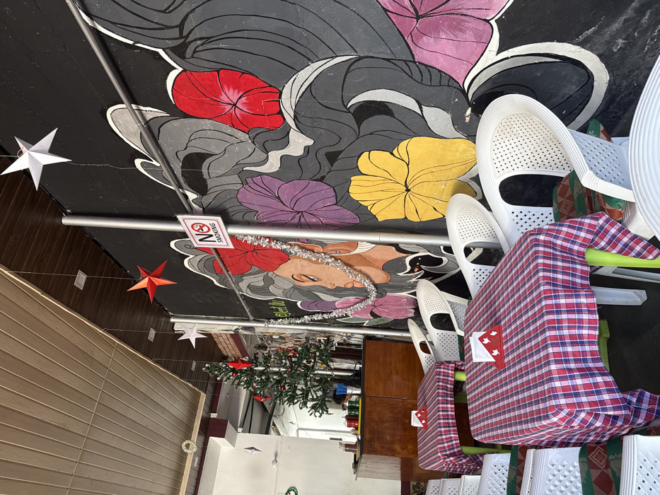 A decorated ceiling features a mural with flowers and a woman’s face, adorned with a silver garland. A ‘No Smoking’ sign hangs from a metal pole. Christmas decorations, including a small tree and hanging stars, add festive cheer. White plastic chairs, some covered with red-and-white checkered fabric, sit beneath. A wooden cabinet is visible, alongside a wall of beige siding.