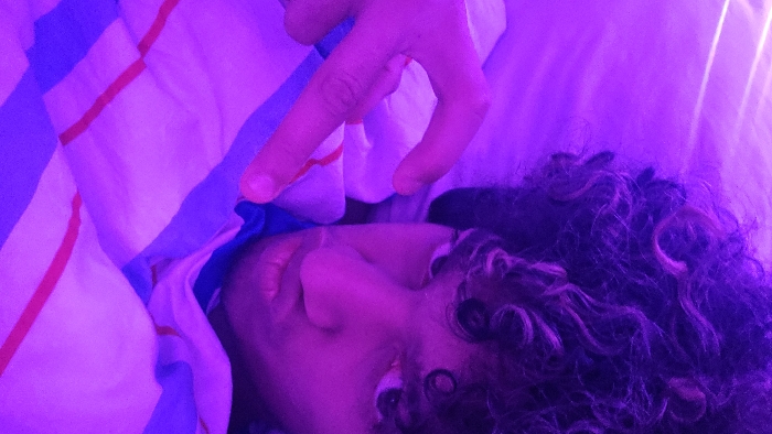 **Location:** Kamenz - Kamjenc, Germany. **Scene Description:** The image depicts an individual in a close-up, upward-angled shot within an indoor setting, likely a bedroom. The entire scene is saturated with a monochromatic purple light source, obscuring natural colors and creating strong shadows. The individual, appearing to be lying down, has dark, curly hair, visible around the right side of the head and forehead. The right side of the face is prominent, including a partial view of the right eye, the nose, and slightly pursed lips, all rendered in shades of purple and magenta due to the lighting. The individual's left hand is raised towards the camera, forming a "peace sign" with the index and middle fingers extended upwards. The person is partially covered by bedding, which appears to be a white duvet or blanket with horizontal red and blue stripe patterns. The folds and textures of the fabric are visible. The background is uniformly purple-lit, consistent with the rest of the environment.