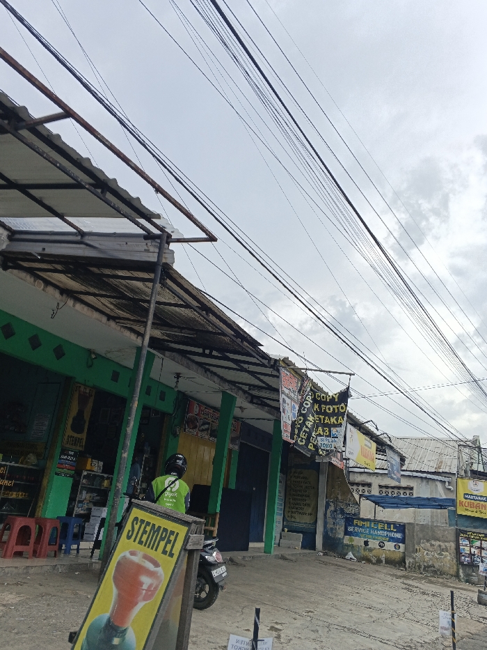 A street scene depicts a row of small shops under corrugated metal awnings. A motorcycle is parked near a sign that reads "STEMPEL" in large letters. Various banners advertise services such as "COPY," "FOTO," "CETAK," and "SERVICE HANDPHONE." Power lines crisscross overhead. The sky is overcast, contributing to the drab atmosphere. A few chairs and shelves are visible inside one of the shops, suggesting a business is open.
