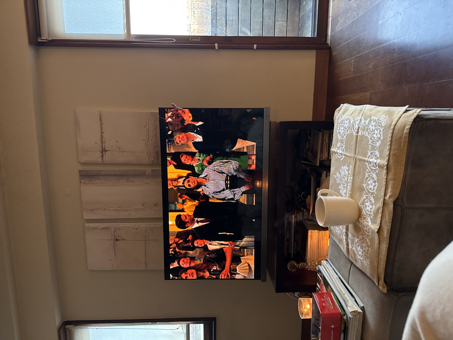 A living room features a TV displaying a crowd scene. To the left of the TV are three vertical abstract art pieces. A dark wooden floor is visible near the top of the frame. A grey sofa with a light brown patterned throw is on the right. A white mug sits on the sofa edge. The scene is lit by natural light from two windows. Books and a candle are positioned near the sofa.