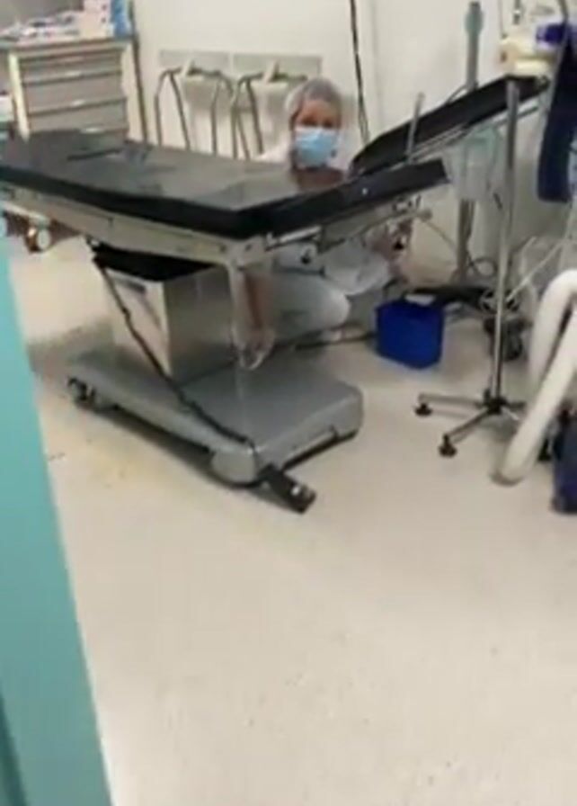 healthcare worker in a surgical setting, cleaning the floor around an operating table