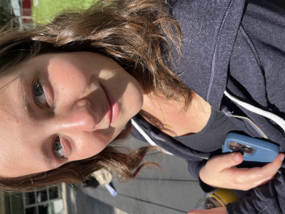An outdoor, sunlit, close-up portrait shows a female subject, approximately 18-25 years old, with medium-length wavy brown hair, blue-grey eyes, and fair skin, which exhibits areas of redness on the face and upper chest. She wears a dark undershirt beneath an open dark grey hooded sweatshirt with white drawstrings and a gold-colored zipper. A thin gold chain with a small rectangular pendant is visible at her neck. She smiles faintly, looking directly at the camera. Her right hand holds a blue smartphone, displaying a multi-lens camera array, against her torso. Partial view of a clear cup containing a yellow item is visible to the lower left. The background features a dark slatted surface, a modern building with reflective glass panels, and a green lawn. This scene is located in Mexico City, Mexico.