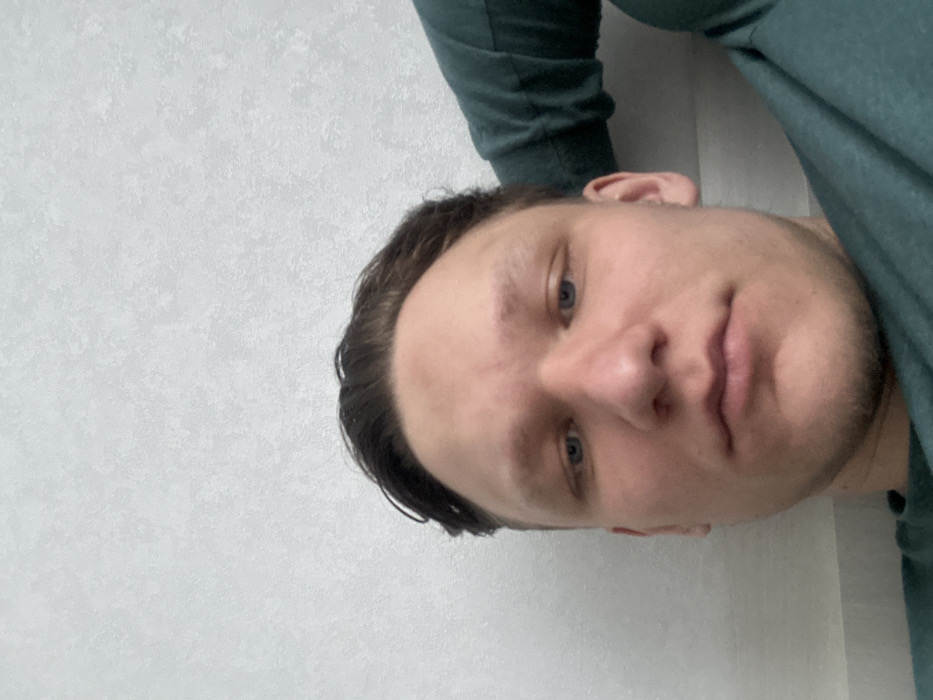 A close-up, front-facing image depicts a young adult male with light skin and a neutral expression. His dark brown hair is styled backward and to the sides, appearing slightly textured. He has light blue eyes, a prominent nose, and full lips, with sparse stubble visible on his chin and jawline. The individual wears a dark teal long-sleeved garment. His left arm is bent, with the sleeve partially visible on the right side of the frame, positioned as if resting or supporting his head. The background is a plain, light grey wall with a subtle, irregular textured pattern. No other objects or individuals are visible. The image itself contains no discernible visual elements to confirm a specific location within the city of Perm, Russia.