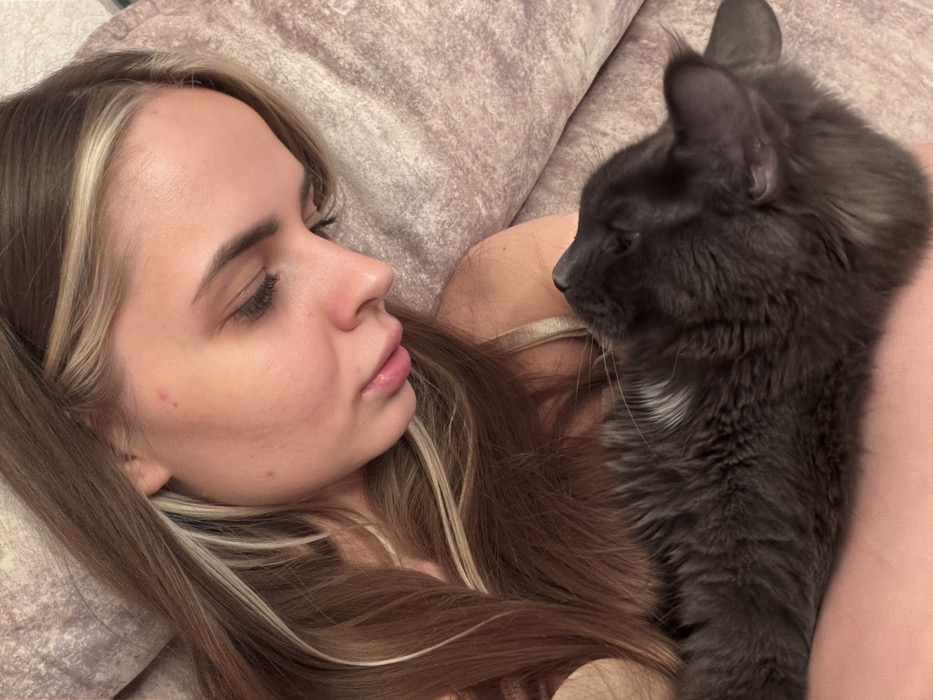 - "A young woman with long brown hair with blonde highlights is lying down, looking at a gray cat" by FM-9DXf93, licensed under CC BY 4.0