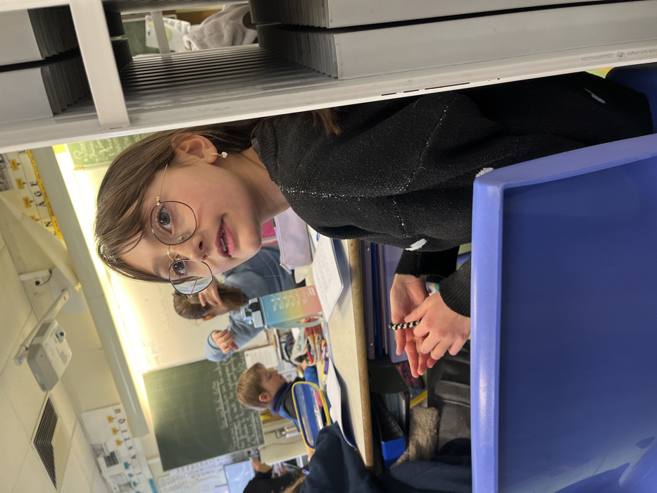The image depicts a classroom in La Fouillouse, France. In the foreground, a young female, estimated to be a child or pre-teen, is seated at a desk with a blue chair. She has medium-brown hair, wears round gold-rimmed glasses, and a small heart-shaped earring in her right ear. Her attire includes a black knitted sweater with white speckled patterns. Her hands are visible, holding a black and white striped cylindrical object. She is looking upwards and slightly to her left, with her mouth slightly ajar. To the right of the frame, a white vertical structure with multiple slats is partially visible. In the background, other students are visible. One girl with brown hair, wearing a light blue top, is seated at a desk with a colorful gradient water bottle and a light pink pencil case. Another young boy with short brown hair, wearing a blue top, is visible further left, engaged with materials on his desk. The classroom environment features a green chalkboard with white writing, white walls with overhead fluorescent lighting, and a ceiling-mounted projector. Partially visible French text, including "N AGE" and "CLASTIQU," is displayed on the wall above the chalkboard.