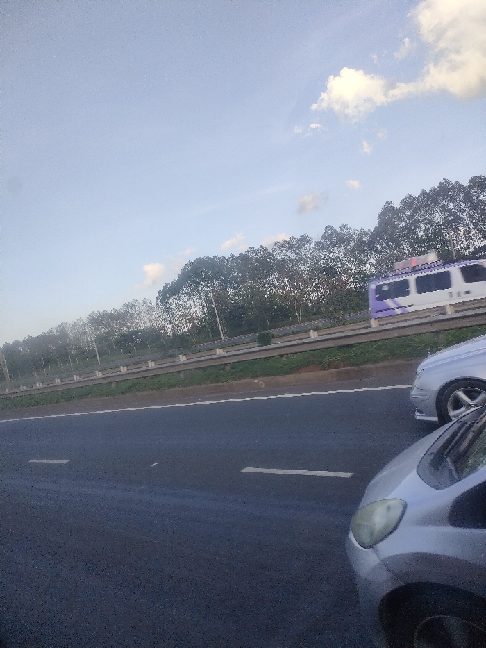 The image displays a multi-lane highway and parallel elevated rail line during daylight hours in Juja ward, Kenya. In the foreground, a dark asphalt road surface with white dashed lane markings is visible. On the right, two silver-colored vehicles are partially depicted; the closest shows its front left headlight and bumper, while a second vehicle's front wheel and lower body are visible behind it. In the midground, a green median strip containing a concrete barrier system separates the highway lanes. Above and behind this median, a white commuter train or light rail vehicle with purple accents is in motion from right to left on elevated tracks, exhibiting motion blur. The background features a dense line of tall, slender trees beneath a pale blue sky with scattered white cumulus clouds.