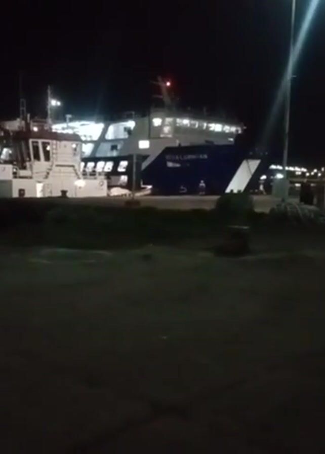 view of a pier or dock at night. A large white and blue ferry or cargo ship is docked on the right. The words "GEGALARLAPAN" are visible on the side of the ship. To the left of this ship is a smaller white vessel. In the background, across the water, there are illuminated structures that may be industrial or port facilities. The foreground consists of a dark paved area. The lighting is sparse, primarily from artificial sources such as the lights on the ships and streetlights.
