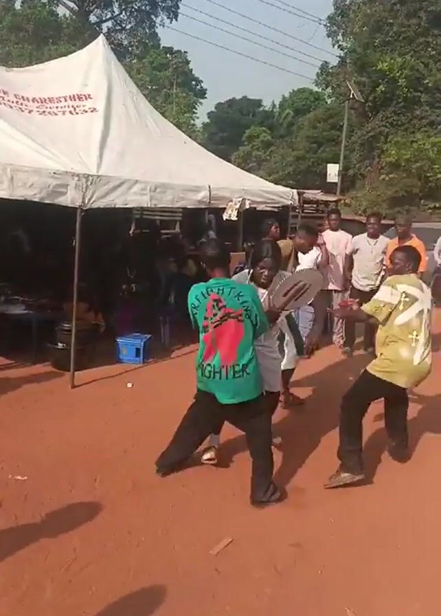 group of people dressed in casual attire playfully interacting in what appears to be an outdoor event. The event is possibly taking place on a reddish soil surface. A white tent is set up in the background, and some individuals are seated under it. Several people are seen dancing, gesturing, and moving around, while a few others observe. One individual is holding a circular object resembling a saw blade. The overall atmosphere seems lively and festive.