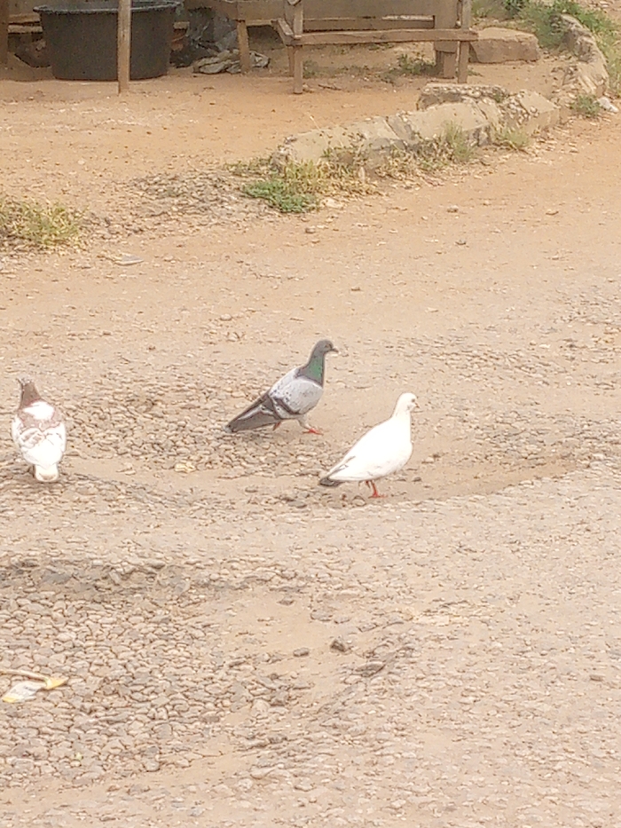 The scene depicts an unpaved, reddish-brown dirt and gravel surface in Adankolo, Nigeria. Three pigeons are present on the ground. To the left, a pigeon with mottled white and brown plumage faces away from the viewer. In the center, a grey rock pigeon with iridescent green neck feathers walks towards the right. To its right, a pure white pigeon with reddish feet also walks towards the right, slightly ahead of the grey pigeon. In the background, on the left, a dark cylindrical barrel or container is visible. Further right, a weathered wooden bench stands on a slightly elevated area. Below the bench, a segmented concrete barrier or curb runs horizontally, with sparse green vegetation growing along it. The area appears to be an outdoor, utilitarian space. No people are visible.