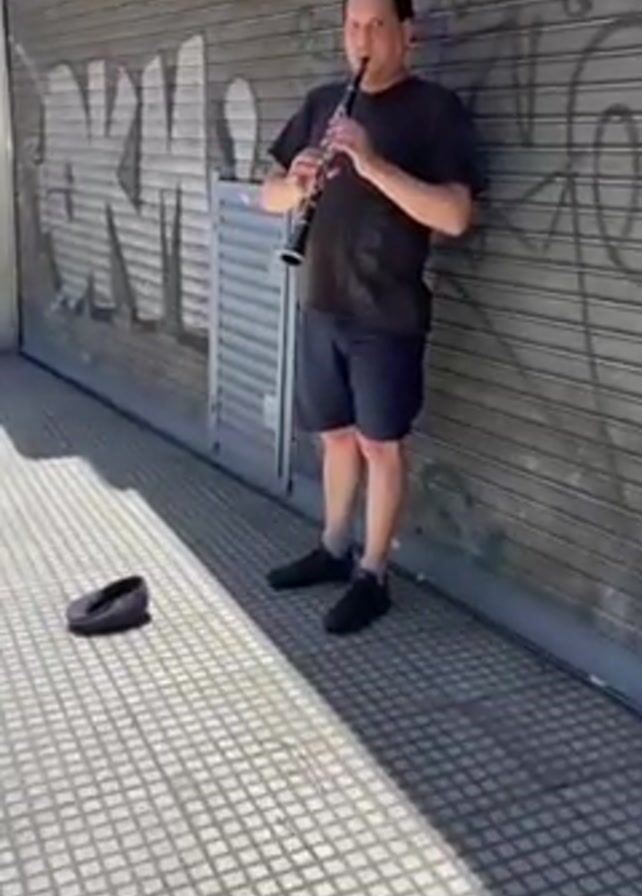 A middle-aged man stands on a paved sidewalk, playing a clarinet. He leans slightly against a metal roll-down door covered in graffiti. He is wearing a dark t-shirt, dark shorts, and black sneakers. A gray baseball cap lies on the sidewalk to his left, presumably for collecting money. The sidewalk is made of square gray tiles. The scene is in daylight.