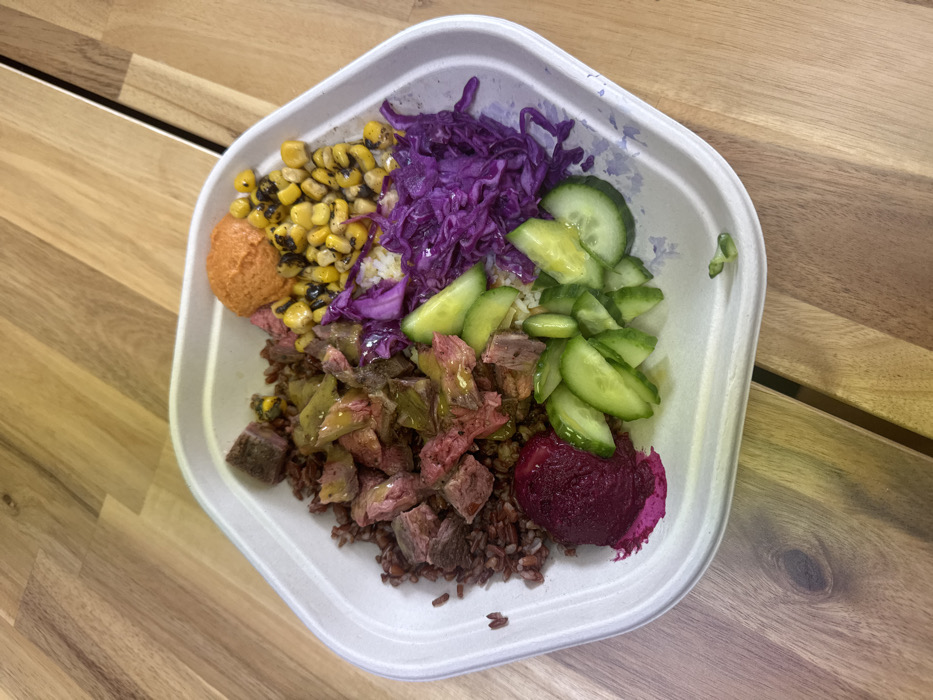 An overhead view captures a hexagonal, white, disposable food container resting on a light brown wooden surface. The container holds a multi-component meal distinctly sectioned. Visible ingredients include reddish-brown rice, diced pieces of cooked meat, light green cooked vegetables, charred yellow corn kernels, an orange-colored dip or puree, finely shredded purple cabbage, numerous slices of green cucumber, and a dark red beet puree. A solitary slice of cucumber and several grains of rice are positioned on the container's edge, outside the main food mass. The scene is located in Paleo Faliro, Greece.