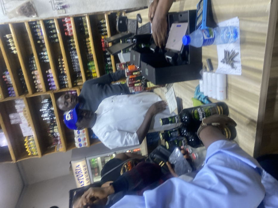 A cluttered table displays bottles of wine, a water bottle, and small containers. A black box contains bottles and a tablet. Two men stand near the table, with shelves of liquor behind them. A sign reads "Astoria Lounge" and a refrigerator is visible nearby. Additional people are partially visible at the table.