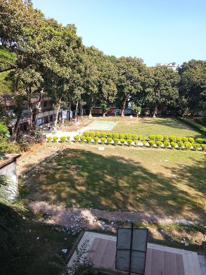 This image displays an outdoor institutional or park setting in Shibpur, Bangladesh, under a clear blue sky. In the immediate foreground, a dark, rectangular, metal-framed sign or monument stands vertically on a light-colored paved platform with steps. The sign features a grid pattern containing multiple faded images or graphics, possibly portraits. To the left of the platform, a section of a white building wall is visible. The ground immediately adjacent to the platform and extending into the lower-mid ground consists of uneven dirt, gravel, and sparse grass, with scattered paper and small debris. The central and mid-ground area is dominated by a large, irregularly shaped grassy lawn, partially illuminated by direct sunlight and partially covered by shadows from overhead trees. A well-defined ornamental border, comprising approximately thirty evenly spaced, spherical green bushes, delineates a section of the lawn. Beyond this border, a lighter green, rectangular sports court, possibly for badminton or volleyball, is visible with white boundary lines marked on its surface. In the background and extending along the left side, a multi-story building with multiple windows and balconies is partially visible, featuring several banners or posters affixed to its facade. Numerous large, mature trees with dense green foliage stand prominently throughout the background and mid-ground, obscuring parts of the building and casting extensive shadows across the grassy areas. No individuals, actions, or specific interactions are present within the frame.