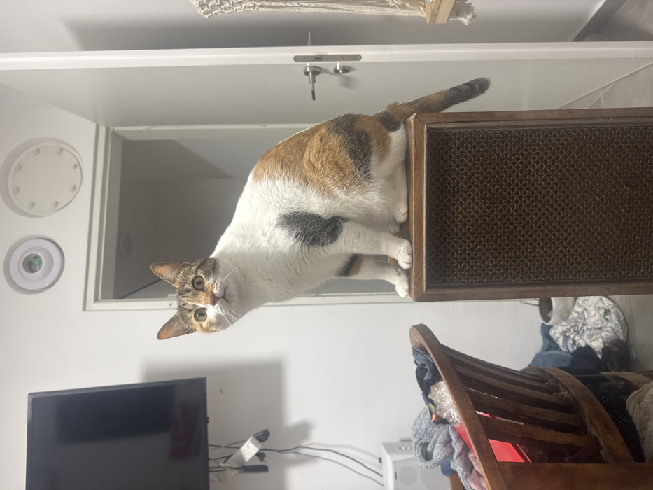 A calico cat stands on a brown wooden object with a textured, dark-colored insert. The cat is white with brown and black patches. Its face is visible, with yellow eyes looking directly at the camera. The cat's tail extends behind it. Below the cat, there's a wooden chair with clothing draped on it. A white wall is visible, featuring a round ventilation cover and a doorway. A television and electrical cords are seen in the lower left corner.
