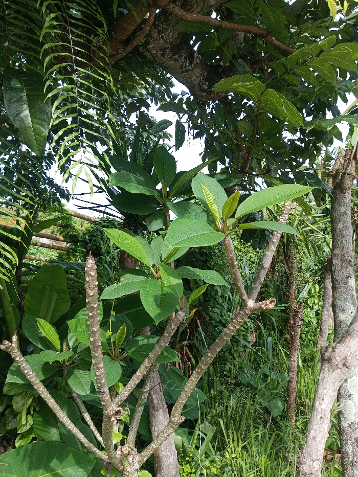 - "A lush garden scene showcases a plumeria tree with segmented branches and vibrant green leaves" by FM-QlJz23, licensed under CC BY 4.0