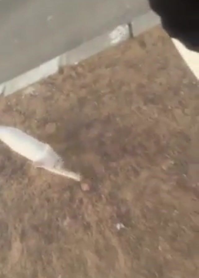 A person wearing white athletic shorts and a black shirt is standing on dirt ground. A white cat approaches and rubs against the person's legs. The person looks down at the cat.