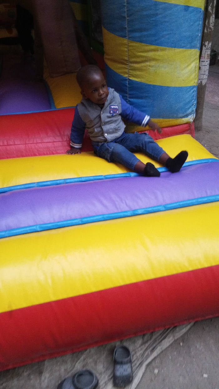 A young Black child, estimated to be between 2 and 4 years old, is seated on a multi-colored inflatable play structure