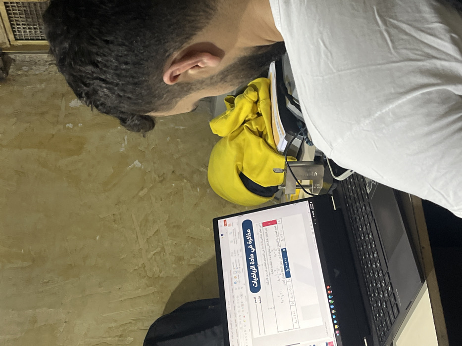 A young man sits at a desk, studying mathematics on a laptop. He wears a white t-shirt, and a yellow jacket is draped over the desk behind the laptop. The laptop displays mathematical formulas and text in Arabic. The background shows a textured, off-white wall. A black laptop bag sits beside the computer on the right of the person.