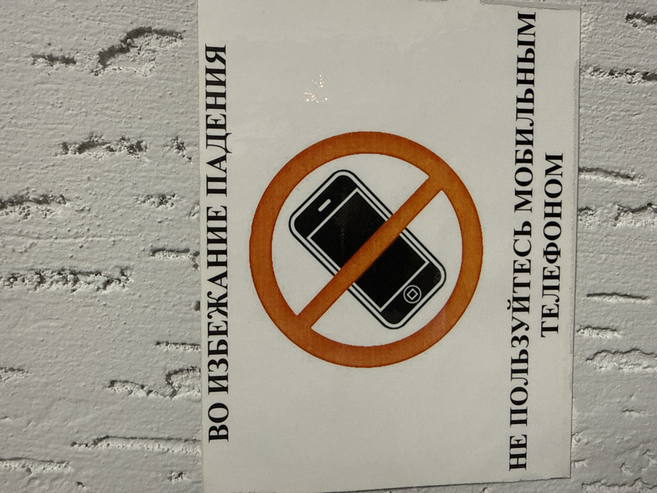 A white rectangular sign, approximately 8.5x11 inches, is affixed to a textured, light grey wall in Krasnoyarsk, Russia. The sign displays black Cyrillic text at the top, "ВО ИЗБЕЖАНИЕ ПАДЕНИЯ" (To avoid falling), and at the bottom, "НЕ ПОЛЬЗУЙТЕСЬ МОБИЛЬНЫМ ТЕЛЕФОНОМ" (Do not use a mobile phone). Centered between the text is a universally recognized prohibition symbol: an orange circle with a diagonal line through it, overlaying a black smartphone icon tilted upwards to the right, featuring a white screen and a circular home button. The wall exhibits a rough, stucco-like texture. The scene is static, with no individuals present or actions depicted, the sign itself serving as a directive in an interior environment.