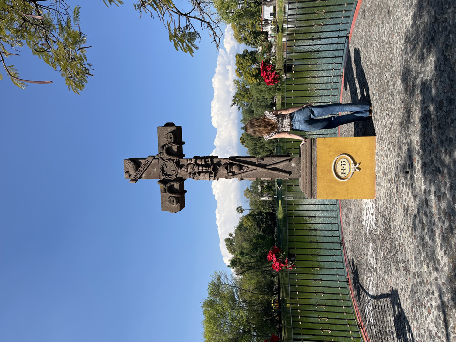 A woman in jeans and a patterned top touches a yellow-toned monument with a framed date, standing beside a dark stone cross adorned with snakes and symbols