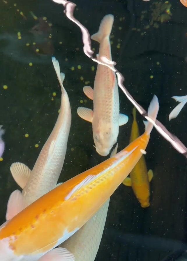 The camera focuses on a group of koi fish swimming in a pond. Several fish are white, with one displaying a bold orange stripe along its dorsal fin. A fish with a gray and white mottled pattern on its back swims closer to the camera, momentarily obscuring the others. The pond water is dark, but the fish are clearly visible, and some golden particles are scattered on the bottom. Reflections on the water's surface add a dynamic element to the scene.