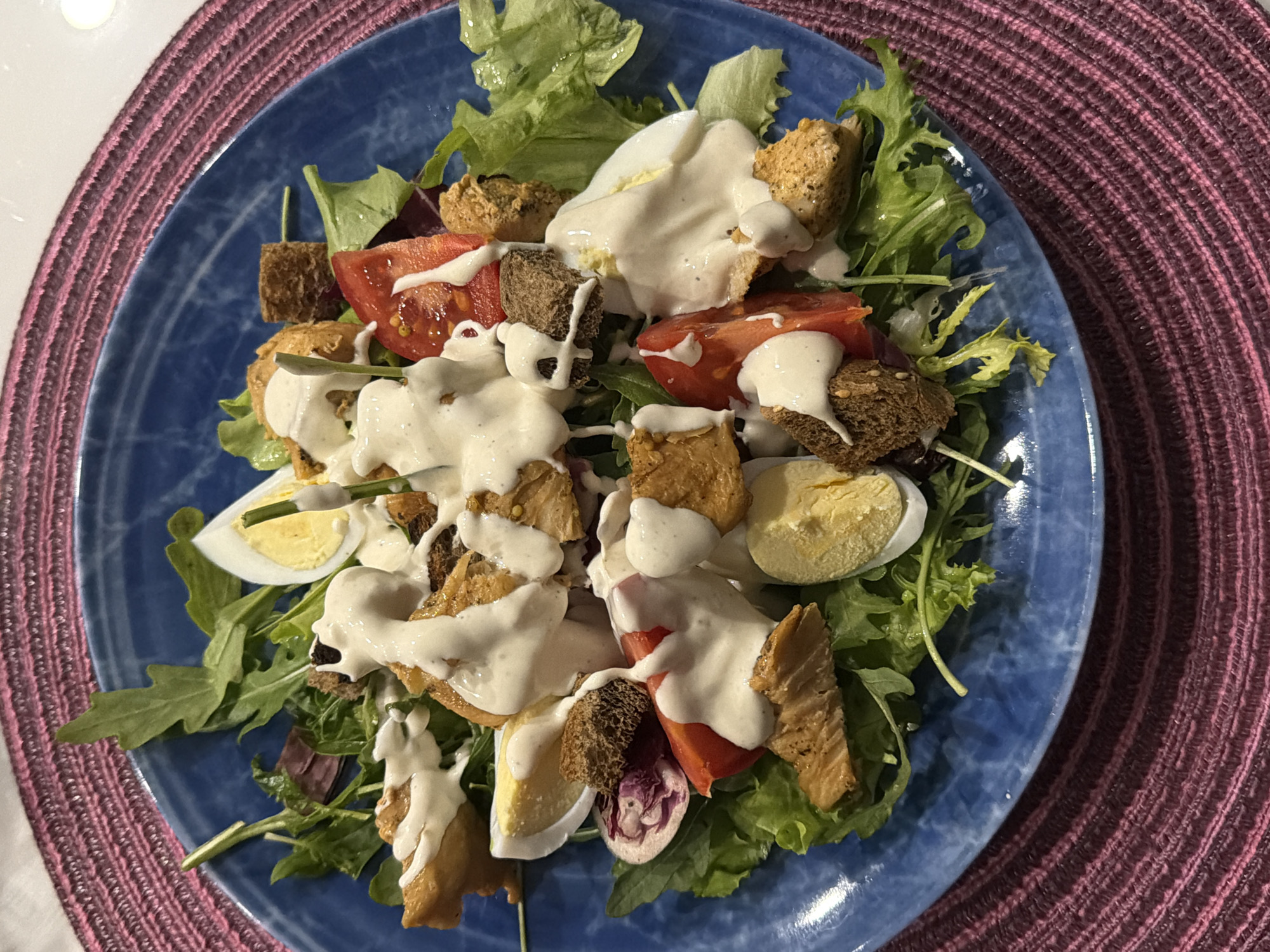 The image presents an overhead, close-up view of a prepared salad served on a round, blue plate with a slightly textured finish. The salad contains a base of mixed greens, including various light green lettuce leaves and some darker green foliage, alongside fragments of reddish-purple greens. Distributed across the greens are irregular pieces of golden-brown, cooked protein, consistent with chicken, and multiple halves of hard-boiled eggs, revealing distinct white and yellow sections. Diced red tomatoes and dark brown, cube-shaped croutons are also visible within the salad. A thick, creamy, off-white dressing is generously drizzled over all ingredients. The blue plate rests upon a round, woven placemat characterized by horizontal stripes in shades of pink and burgundy. A small portion of a white surface, likely a table, is visible in the upper right background. The scene depicts a meal, located in Novoalexandrovka, Russia.